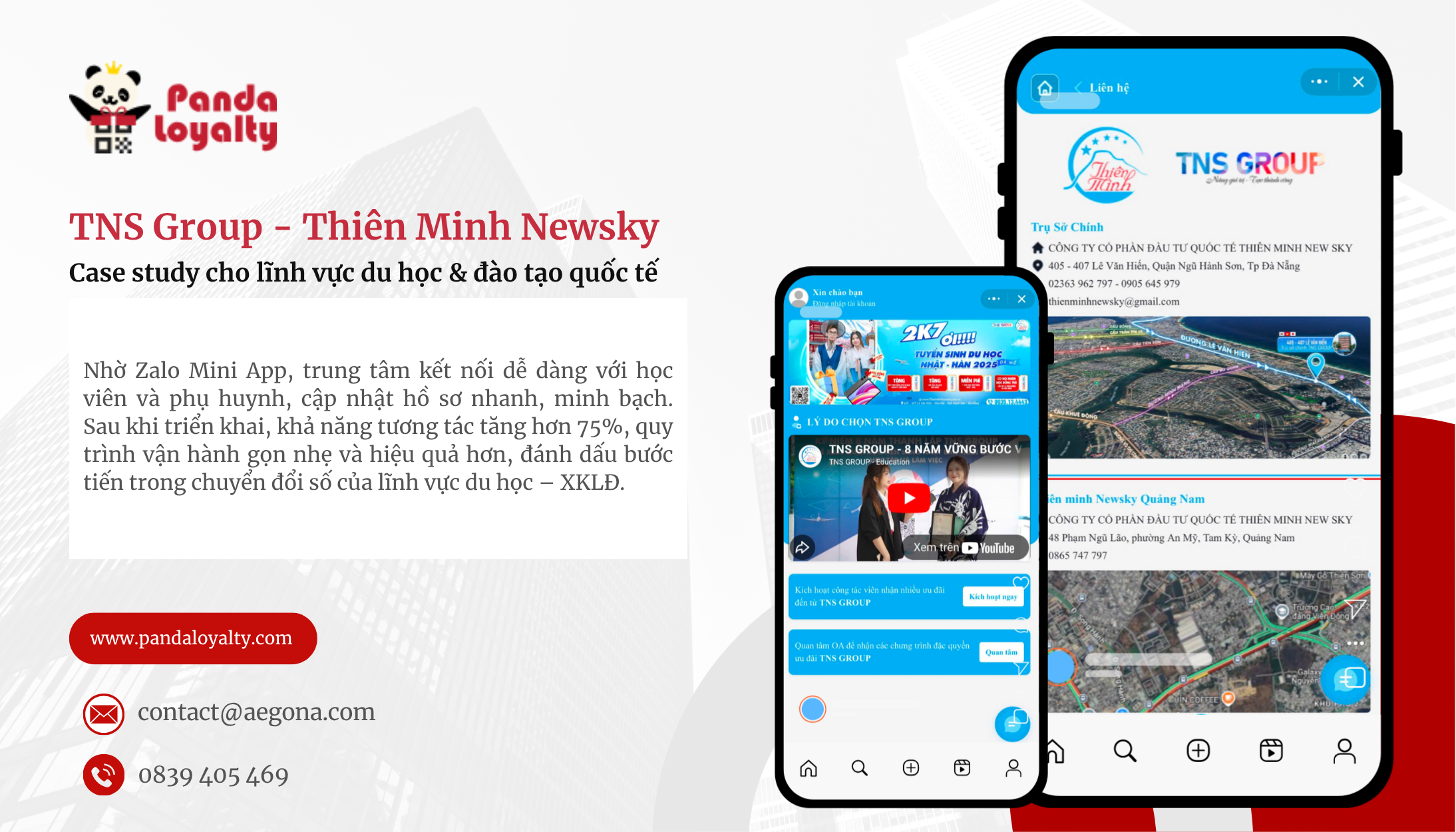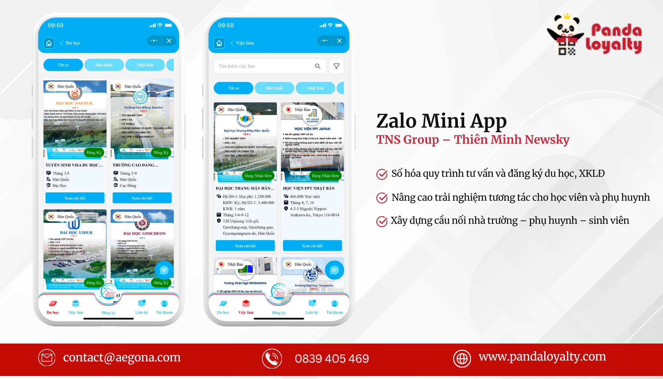 Panda Loyalty là giải pháp phần mềm chăm sóc khách hàng và quản lý dữ liệu thông minh do công ty Aegona phát triển, tiên phong triển khai các giải pháp số hóa trên nền tảng Zalo Mini App cho nhiều lĩnh vực, trong đó có tư vấn du học và xuất khẩu lao động.